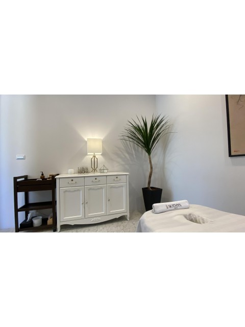 一走進店內,寬敞明亮的接待區以白色與淺木色為主調,搭配溫潤的燈光與大理石檯面,營造出現代感與療癒氣息兼具的空間。展示櫃陳列高端保養品與療癒選品,彰顯品牌對美學與品味的講究。